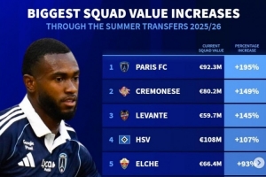 体育资讯9月7日讯 《转会市场》统计了今夏转会窗过后的总身价上升比例情况,多家升班马霸榜。