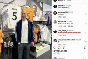 照片中齐达内现身皇马商店里,店里挂售着他的5号经典球衣。齐达内配文:“加油,马德里!⚽️”