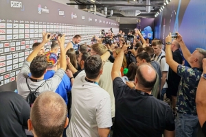 体育资讯9月8日讯 男篮欧锦赛1/8决赛,斯洛文尼亚84-77击败意大利,晋级八强。赛后东契奇出现在混合采访区接受采访时,被记者围得水泄不通。欧媒Eurohoops评论到:“东契奇的出现让混合采访区陷入了混乱。”