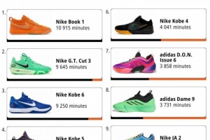 其中布克的签名鞋Book 1排名第一、共计上场时长10915分钟。而科比的三代球鞋也都有上榜,还有利拉德、米切尔以及莫兰特的签名鞋。