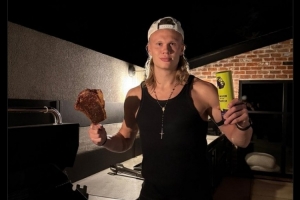 赛后这名前锋更新社媒,一身休闲装扮,手拿烤肉与英超官方全场最佳球员奖杯。