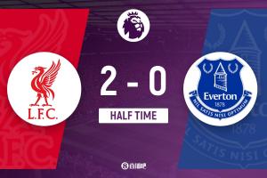 上半场伤停补时1分钟,半场结束,利物浦暂2-0埃弗顿。