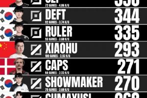 外媒统计S赛正赛选手击杀数:Faker稳坐第一 Uzi第二、Xiaohu第五