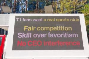 体育资讯04月10日讯 据韩国网友当地消息,T1粉丝再次派遣广告卡车,就T1俱乐部CEO对队伍的干涉做出抗议。