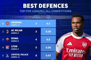 体育资讯10月7日讯 德国转会市场统计了五大联赛球队本赛季的场均丢球数量,并列出场均丢球最少排名,阿森纳0.3球居首,米兰0.38球次席。