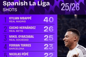 下一篇: 西甲禁区触球数排行:维尼修斯76次居首 姆巴佩第2、拉什福德第3