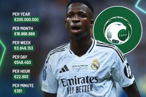 若维尼修斯在沙特联赛1年的薪水为2亿欧,折合月薪则为1667万欧、周薪385万欧、日薪55万欧,每分钟380欧,每秒钟6.34欧,约等于每呼吸一次赚取25欧。