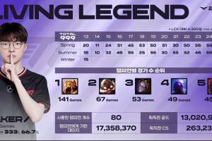 体育资讯4月10日讯 LCK常规赛T1对阵KT赛前,Faker赛前数据,总场次999,胜场666,负场333,胜率66.7%。