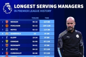 英超历史主帅任职时长榜:温格、弗格森前二,瓜迪奥拉第四
