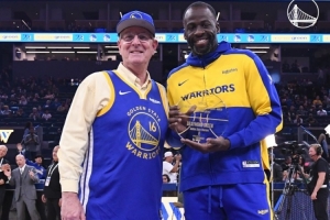 赛前勇士球星追梦领取了上个月月最佳防守球员的奖杯。