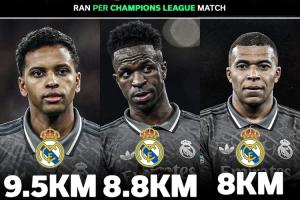 赛后媒体统计了皇马与巴萨的球员跑动情况,36岁的巴萨前锋莱万,本赛季欧冠场均跑动达到了10.1千米。而皇马三叉戟中,跑动最多的罗德里戈也只有9.5千米,维尼修斯8.8千米,姆巴佩则只有8千米。