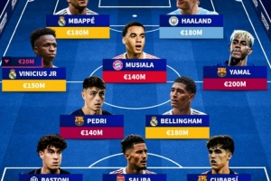 中场:维尼修斯(皇马,1.5亿欧)、佩德里(巴萨,1.4亿欧)、穆西亚拉(拜仁,1.4亿欧)、贝林厄姆(皇马,1.8亿欧)、亚马尔(巴萨,2亿欧)