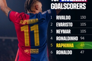 体育资讯4月11日讯 巴萨官推晒出了队史巴西球员射手榜,其中里瓦尔多居首,拉菲尼亚超越大罗升至第5,以下为具体榜单: