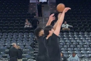 赛前,杨瀚森和队友夏普一起进行三分投篮热身。