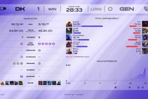 体育资讯4月13日讯 LCK常规撒DK首局击败GEN,Siwoo使用杰斯伤害爆炸打出34.3k伤害,远超GEN双C Chovy、Ruler二人伤害之和32.6k。