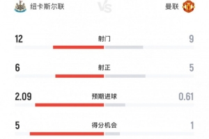 两队全场数据如下(主队纽卡在前,客队曼联在后):