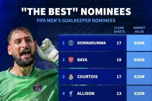 FIFA最佳门将候选身价排名:多纳鲁马、拉亚4000万欧居首
