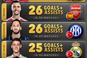 体育资讯11月10日讯 Score90统计了2025年五大联赛中场球员在俱乐部+国家队比赛中参与进球的数量,并列出榜单。