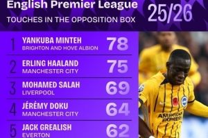 本赛季英超在对方禁区内触球榜:哈兰德、萨拉赫、约克雷斯在列