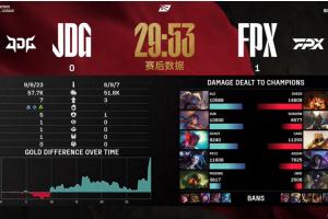 体育资讯4月14日讯 今日LPL第二赛段JDG与FPX战至1比1平,在第二局比赛结束后官方直播间数据面板显示比分仍为JDG 0-1 FPX。