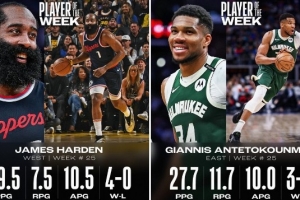 体育资讯4月15日讯 今日NBA官方公布了本赛季常规赛最后一周周最佳,快船球星哈登和雄鹿球星字母哥当选。
