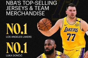 在NBA官方公布的NBA官网2024-25赛季常规赛下半赛季球员球衣销量排名榜中,东契奇位列第一,詹姆斯位列第三;湖人位列下半赛季球队周边产品销量榜榜首。