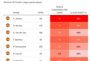 体育资讯4月15日讯 欧联杯1/4决赛首回合,曼联2-2战平两,奥纳纳两次失误导致丢球。加之赛前与马蒂奇的口水战,奥纳纳的状态再次受到质疑。The Athletic判点了曼联历代门将的数据。