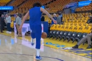赛前,勇士球员盖-桑托斯大秀脚法,他丝滑颠球后转身射落三分,手感和脚感都很出色。
