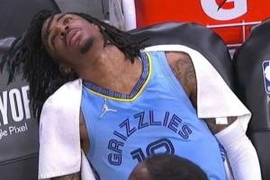 莫兰特在球员通道前接受治疗 并往嘴里塞了一些东西(疑似止痛药)