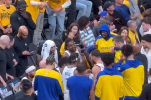 库里拿着战术板激情指挥,追梦两次想插话都没插成功,有些尴尬,和库里竖了个大拇指(大哥你先说),随后在库里说完也指挥了两句