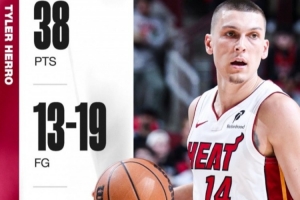 此役热火后卫希罗高效发挥,打了37分钟19投13中,三分7中3、罚球10中9砍全场最高38分外加5篮板4助攻1抢断,也有多达7次失误,正负值+18。