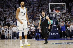去年NBA西部决赛G2,森林狼108-109遭独行侠绝杀,最后时刻,戈贝尔拼尽全力防守东契奇,但被后者晃到“跳舞”,后者在他头上命中准绝杀。
