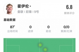 体育资讯4月18日讯 欧联杯1/4决赛次回合,曼联主场迎战里昂。霍伊伦首发出战,0射门,总计13次对抗2次成功,送出3次关键传球,评分6.8。