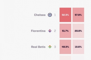 体育资讯4月18日讯 欧协联1/4决赛战罢,切尔西、佛罗伦萨、贝蒂斯、尤尔加登晋级四强。Opta超级计算机预测了各队夺冠的概率,切尔西57.8%居首。