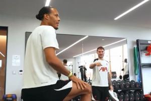 视频其中一个片段,利物浦球员前往健身房训练,队长范迪克在门口查迟到,麦卡利斯特拿着鞋最后抵达。