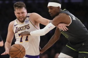勒布朗看清了森林狼贴身防,于是狡黠反切,吃爱德华兹打三分;里夫斯造兰德尔犯规,卢卡娴熟地造犯规,维持着分差,然而迪文岑佐半场压哨远射,让湖人的节奏破灭。