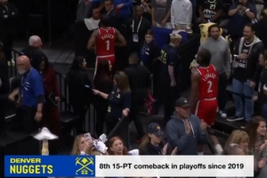 掘金今天最多落后快船15分,但逆转加时取胜,现场给出统计,这是2019年以来掘金第八次是季后赛完成落后15+的逆转!