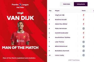 范迪克获得了51.9%的投票,他本场传球成功率87.7%。科纳特获得15.7%的投票排名第二,麦卡利斯特排名第三,他获得13.3%的投票。