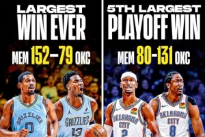 今天,雷霆131-80大胜灰熊复仇,51分是季后赛历史第五大的净胜分!