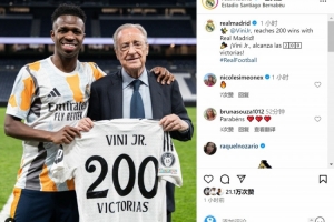 此役是维尼修斯皇马生涯获得的第200场胜利,俱乐部主席弗洛伦蒂诺向他颁发200胜纪念球衣,皇马官方社媒晒出两人的合照,对维尼修斯表示祝贺。