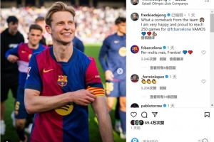 此役是德容巴萨生涯出战的第250场比赛,他在社交媒体上晒出自己佩戴队长袖标的照片:“球队的逆转太精彩了!我很高兴和自豪能为巴萨出战250场比赛,加油!”