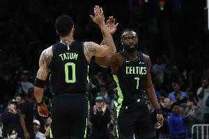 塔图姆全场出战40分钟,投篮22中8,三分8中1,罚球4中0,得到17分14篮板4助攻1抢断1盖帽。杰伦-布朗14投6中,三分2中0,拿到16分。