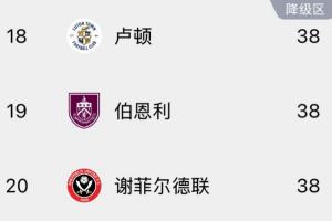 卢顿、伯恩利、谢菲联上赛季一同从英超降级,如今伯恩利和谢菲联为升超而战,卢顿则是身陷降级区,可能面临两连降。