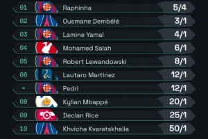 体育资讯4月21日讯 Squawka列出了2025年金球奖赔率排名,拉菲尼亚居首,登贝莱,亚马尔二三位,前7名巴萨占4席。