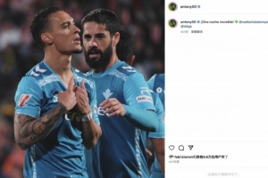 赛后,安东尼社媒晒出与伊斯科合照:又是一个美妙的夜晚!
