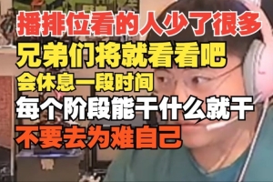 我播英雄联盟就直播只能播英雄联盟排位,播别的没有办法播,就是一个我很难受的一个点,播别的没有整活那种感觉的话就很难播,但是现在播排位看的人确实少了很多,不管是谁都是这样子,看这个游戏看排位的人就是变少了,这个话题就聊到这吧,能力有限,在每个阶段能干什么就干,不要去为难自己。