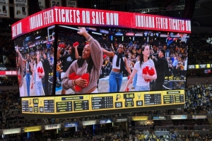 印第安纳狂热队球员凯特琳-克拉克 (Caitlin Clark)、阿莉亚-波士顿 (Aliyah Boston) 和凯尔西-米切尔 (Kelsey Mitchell) 到场观看步行者队与雄鹿队的G2,帮忙向球迷们扔球迷送礼物。