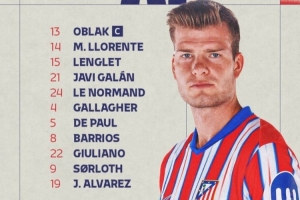 马竞首发:13-奥布拉克、14-马科斯-略伦特、15-朗格莱、21-加兰、24-勒诺尔芒、4-加拉格尔、5-德保罗、8-巴里奥斯、22-朱利亚诺-西蒙尼、9-索尔洛特、19-阿尔瓦雷斯