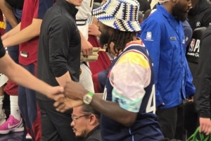 前NBA球员贝弗利身穿快船球员祖巴茨的球衣来到现场观战。
