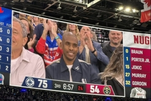 比赛中,直觉巨蛋上空的巨屏显示,马刺球星、前快船球员保罗也来到现场,为母队加油助威。